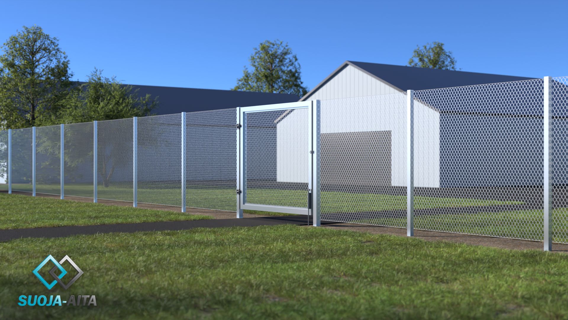 Verkkotäytteistä saranaporttia käytetään usein teollisuus- ja toimitilakohteissa panssariverkkoaidan rinnalla.